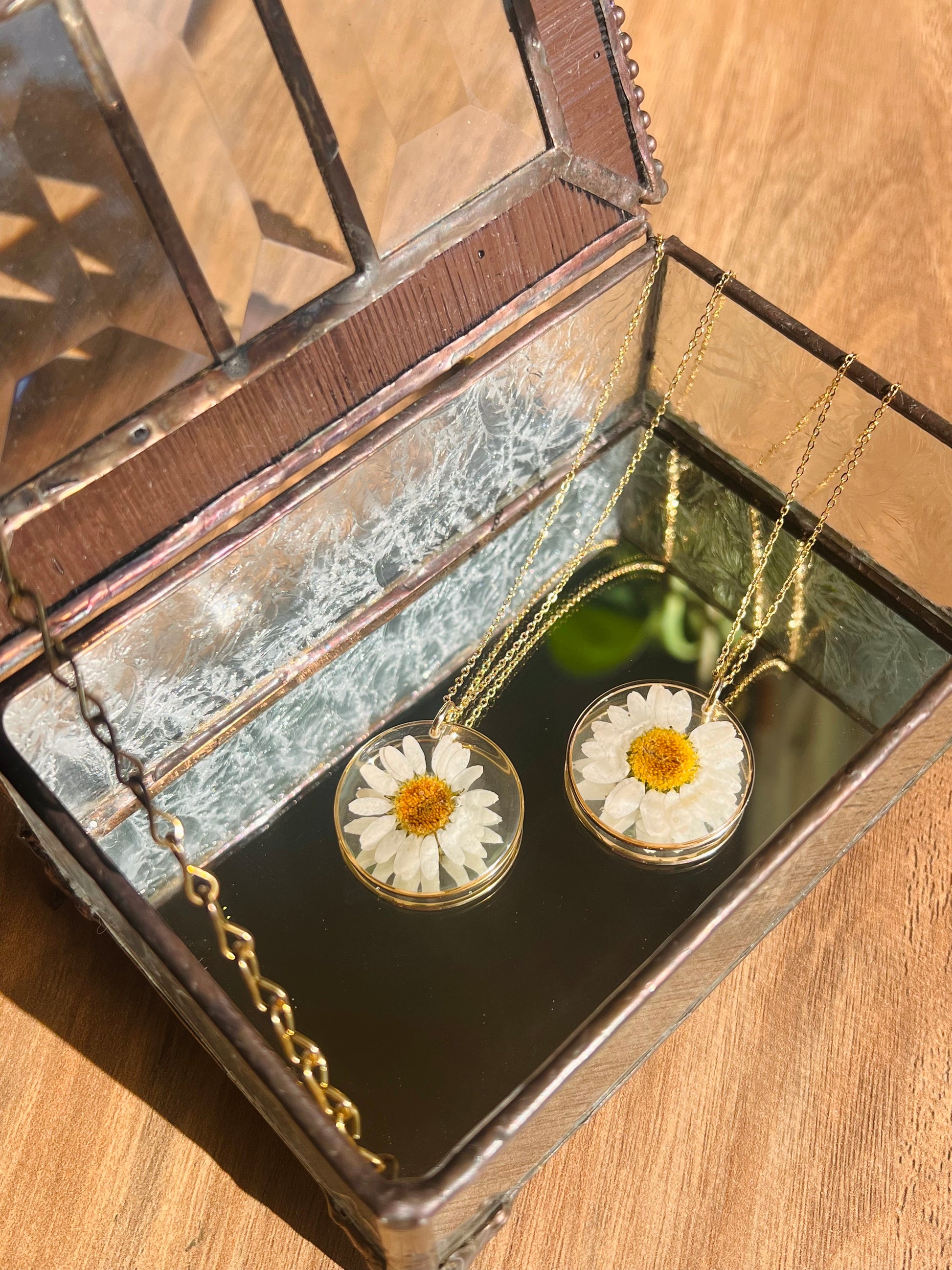 The Daisy necklace features a real daisy delicately preserved to maintain its natural beauty. The daisy is carefully encased in a clear resin pendant, allowing its intricate details to be showcased and admired.